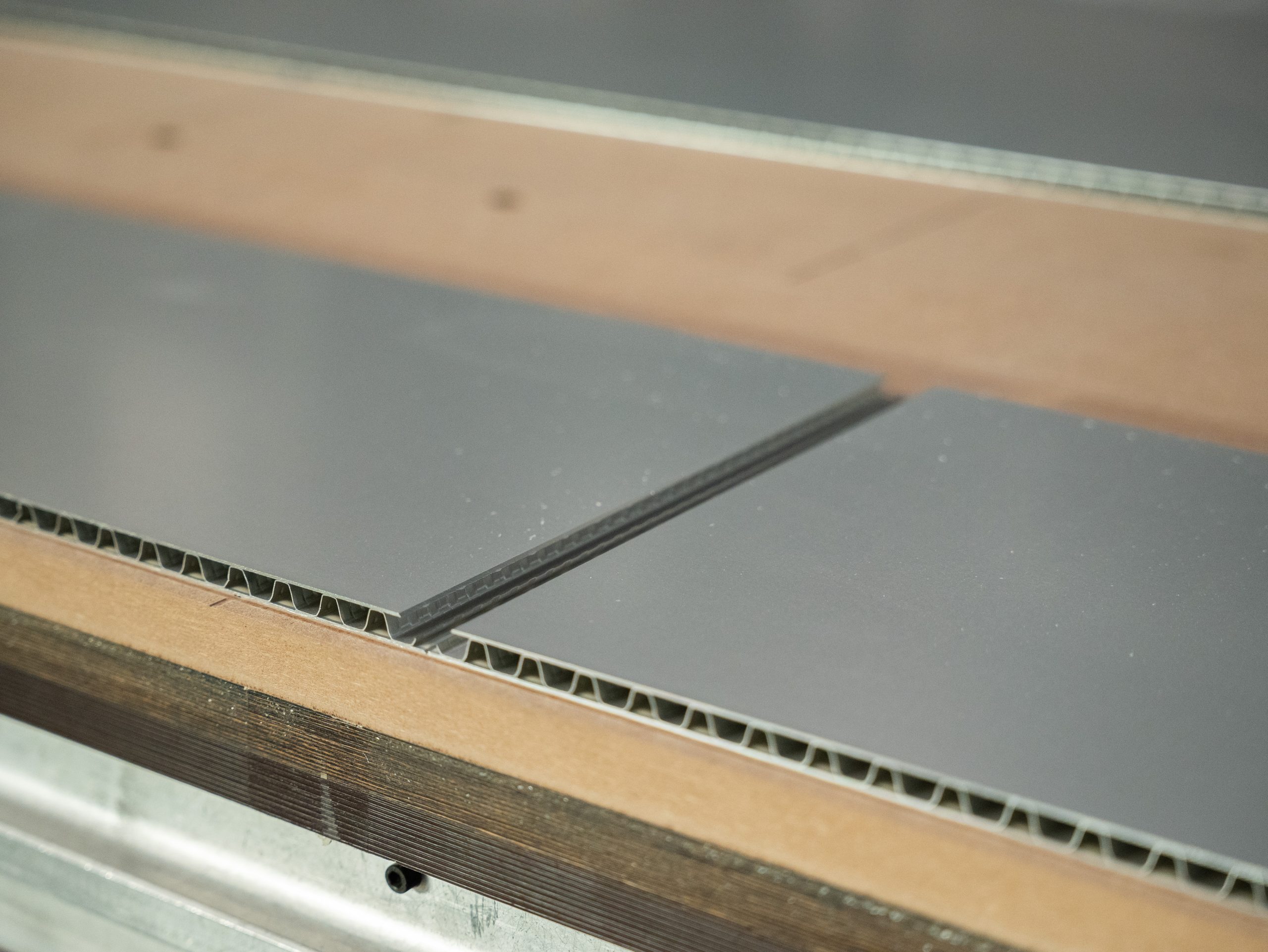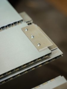 - Incollaggio: permette di unire pannelli tra loro senza elementi a vista, ottenendo un risultato estetico pulito. Le colle distribuiscono uniformemente i carichi, sigillano contro i liquidi, non appesantiscono l’elemento e mantengono la geometria originale. Inoltre, il collante consente di fissare il pannello a diversi accessori.